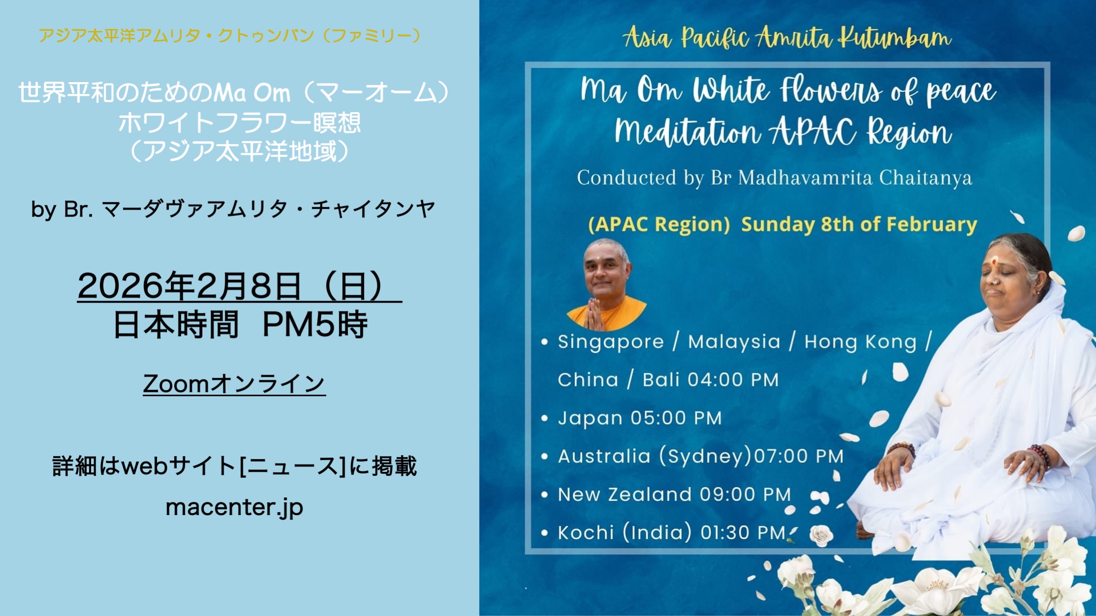 APAC MaOm(マーオーム)と世界平和のホワイトフラワー瞑想会(オンライン)2026/2/8