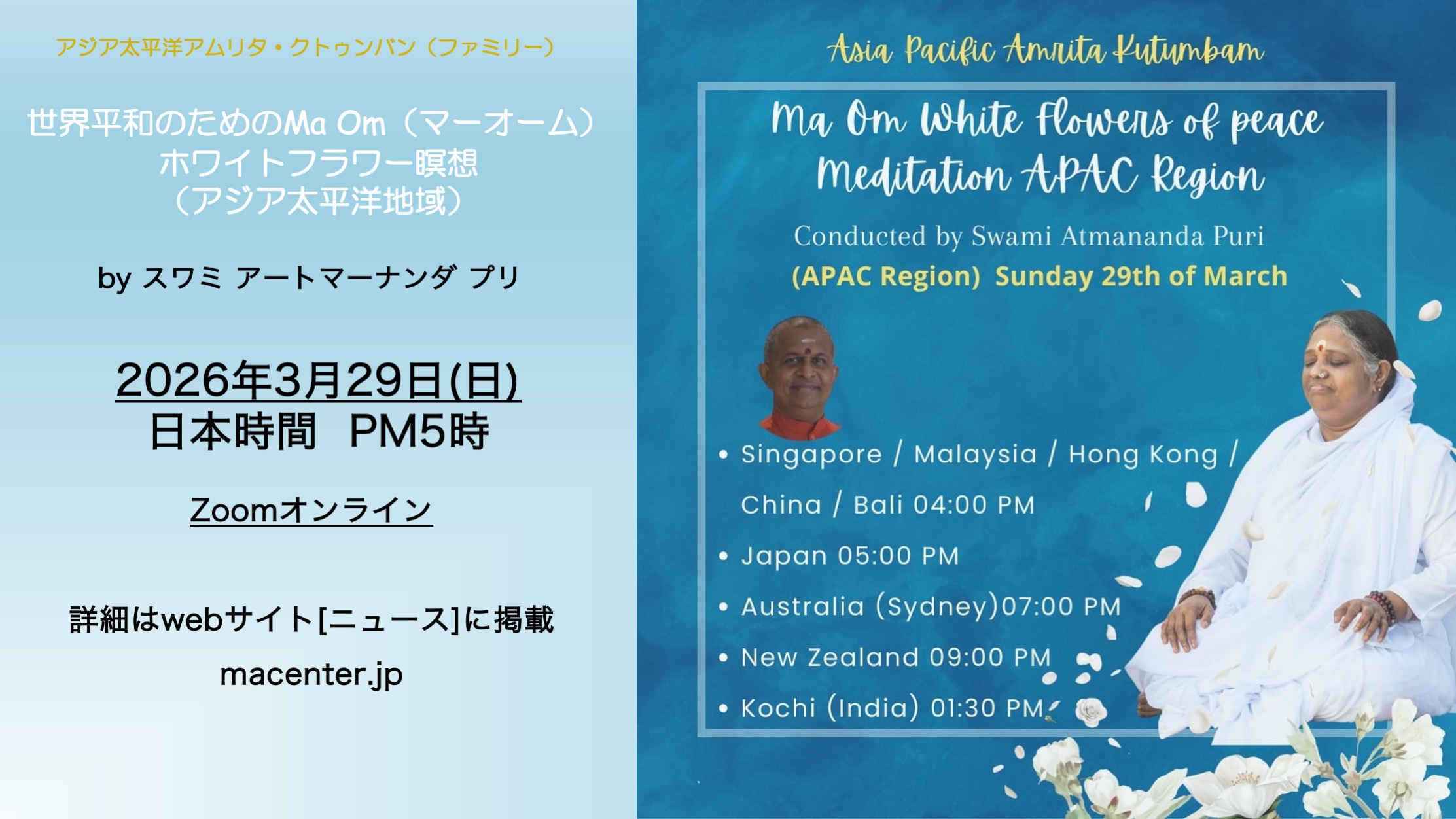 APAC MaOm(マーオーム)と世界平和のホワイトフラワー瞑想会(オンライン)2026/3/29